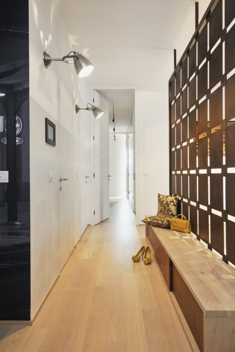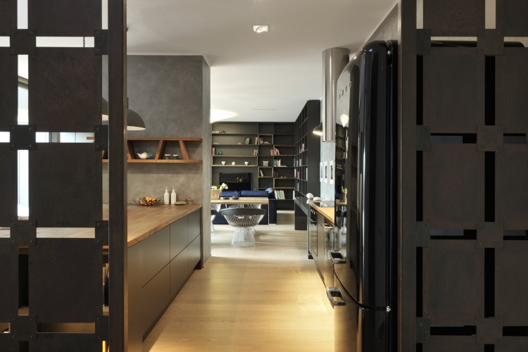 We opened up the living area and divided it from the hallway with a slightly transparent corten wall. The center of the kitchen, the kitchen counter made from oak tree wood, is most definetly the heart of the apartment. We used a construction pier as a base for the kitchen counter which is built around it and which serves as a multifunctional element, offering not only a surface for cooking and serving but also as a wonderfull socializing area.