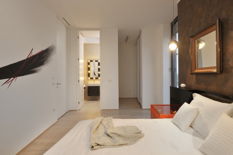 Each one of the rooms is defined with it’s own detail, such as a swinging chair, a boxing bag or a painting covering the central wall – but all of this comes together funktionaly with two large bathrooms and two wardrobes accross the hallway.