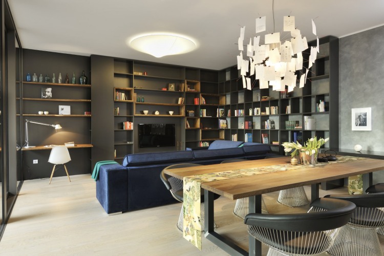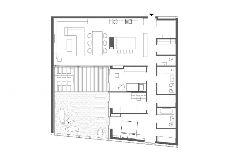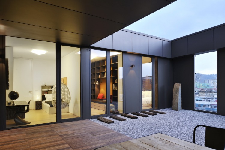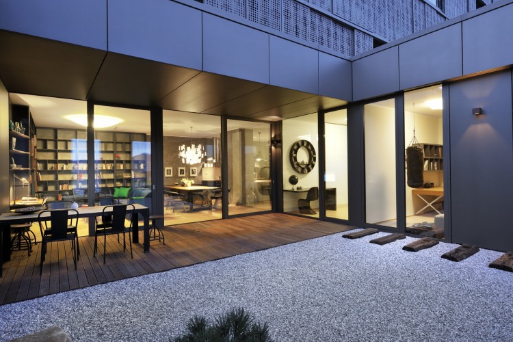 The space is therefore divided by the pier and so the living-dining room opens up to a beautiful atrium which was inspired by the japanese gardens, but upgraded by incorporating some old wodden railway tracks as a sort of platform used for passing the garden and it’s fragile pebbel decoration.
