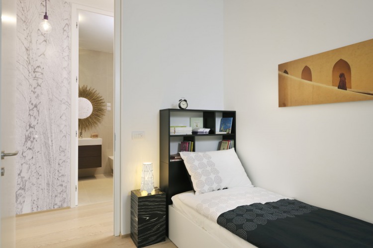 Further on the main hallway divides the more private area of the flat into three separate rooms, thus being the bedroom, the guest room and a smaller bedroom ideal for teens or children. The walls of the hallway are covered in wallpaper displaying birch trees. This elements makes for a soft transition from a public to a more private part of the flat.
