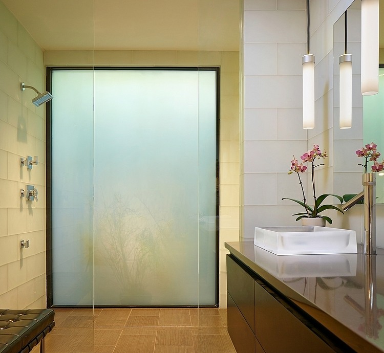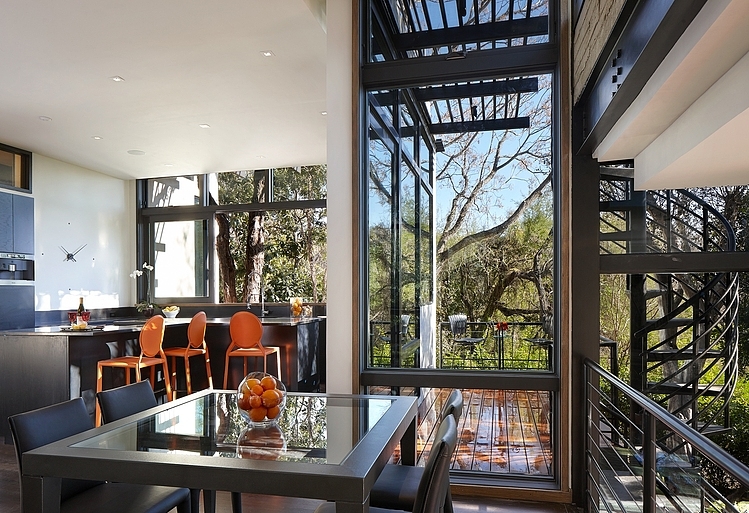At the ground floor changes in level, stepping up over the pool along the main entry bridge and back down again from the kitchen to the living area, provide a playful dialogue and transition between public spaces, even as a largely open floor plan and generous windows act to connect these spaces to each other and the outdoors. Additionally, wall-to-wall sliding doors in the living area open up to expand the room out into the pool and landscape that provides additional outdoor space for entertaining and gathering of friends and loved ones. The entry bridge spanning the pool enlivens these outdoor spaces with a grotto waterfall niche that compliments the cool shade of the heritage trees that reside throughout the yard. This rhythm is mirrored at the second floor as a series of folding doors in the ‘party room’ open to a large out-door terrace in the tree canopies, which again steps down to its own ‘landscape’ green roof garden with hot tub that takes in distance vistas of downtown.