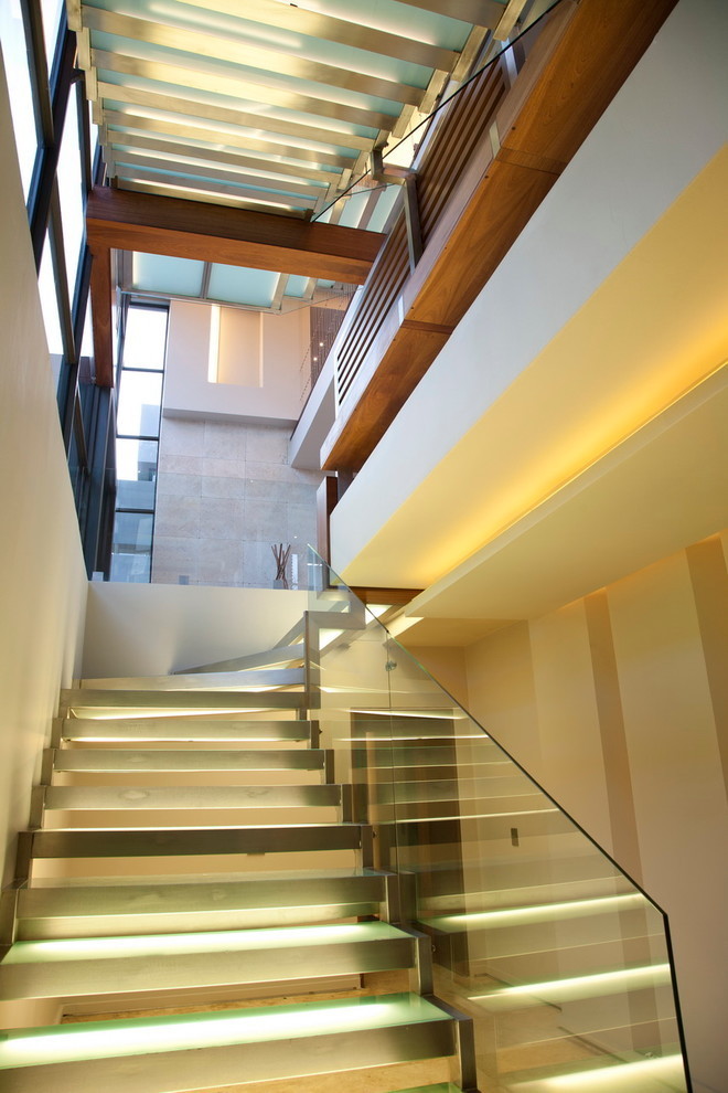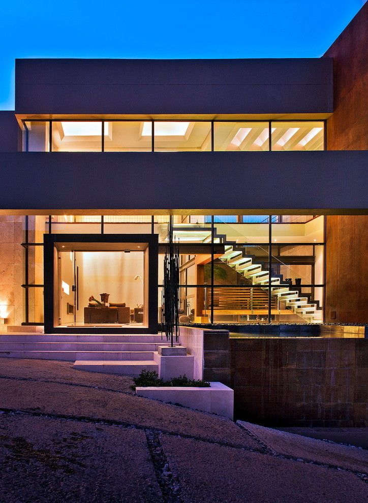 A large reflective koi pond flows over a retaining wall next to the drive way, with an illuminated glass staircase behind a two storey curtain wall in the background.