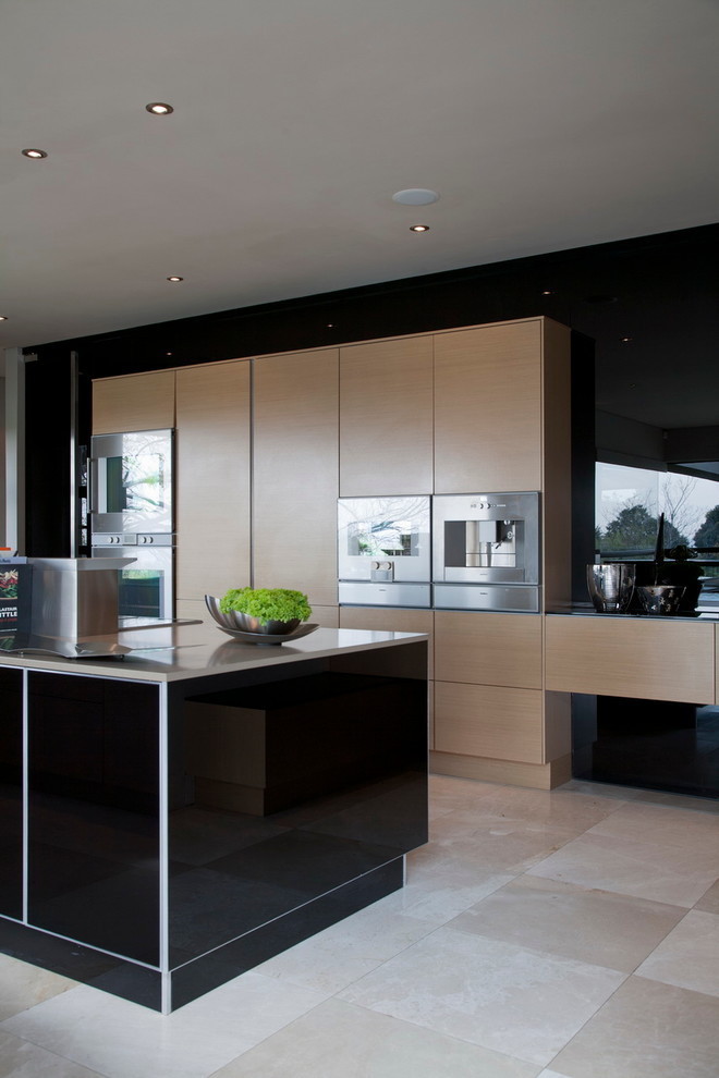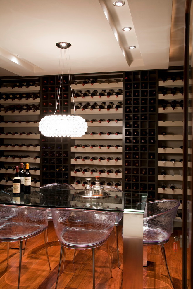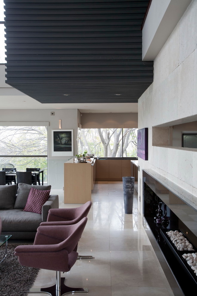The team from M Square Lifestyle Design echoed the exterior wall colours of rusted steel internally by using orange and purple, designing a false wall in the lounge to contain the fireplace and recessed illuminated niches.