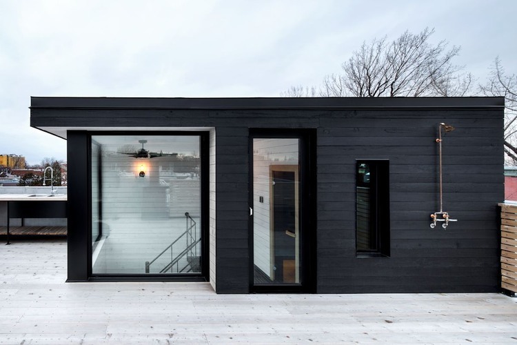 At the center of the renovation, the roof extension acts as a light well into the space. The metal stairs and landing are kept light and transparent borrowing from the traditional exit stairs found in the alley. It houses a sauna with a window framing the church’s dome and connects to a roof terrace with views to the neighbourhood and mountain. The roof terrace was designed as a comfortable space both to lounge in after a sauna and cold exterior shower and to entertain with built-in flower boxes, bench and outdoor kitchen.