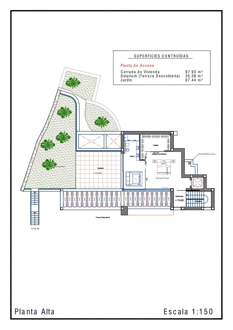 We continue rising and reach the top floor, where the master bedroom with an amazing dressing room awaits us. The bathroom, separated by a fixed screen where entry is made through a sliding door. It has a bubble bath that overlooks the bay and the sea, even more so if we open up the windows to let the fresh air in. A solarium of 35m2 (376ft2) and a garden of 70 (753) complete the upper floor of “La Perla” of the Mediterranean.