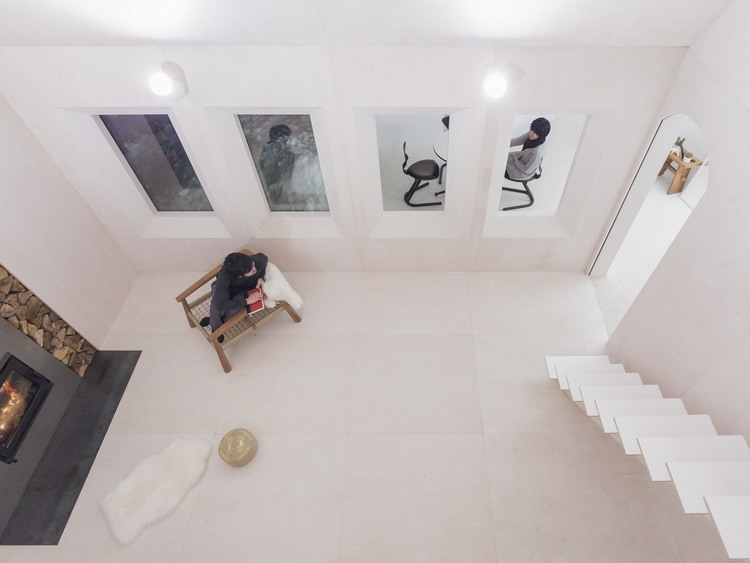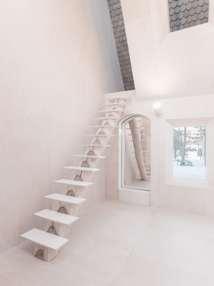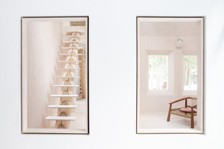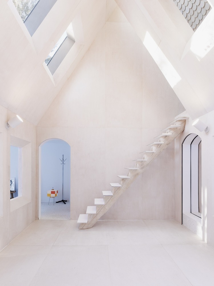 This mixture of feeling between nature and building continue into the interior. The main living space is design as a self-contained interior volume, while the peripheral rooms are treated as part of the building site. Fourteen openings into this grand living space reveal both inhabited spaces, skies and trees, equally treated and further articulated with edges finishes of interior panel kept raw to show the inherit nature of materials used. This abstract nature of the interior spaces allows imagination to flow, and those spaces that could be identified as a domestic interior can suddenly become play spaces. A solid timber staircase leads to a loft which has the feeling of ascending into tree canopies as sunlight softy falls on wall covered in fish-scaled shingle stained in light blue.
