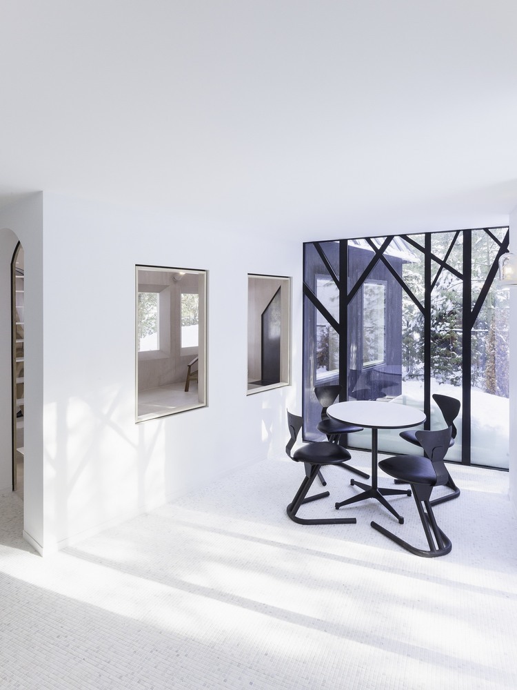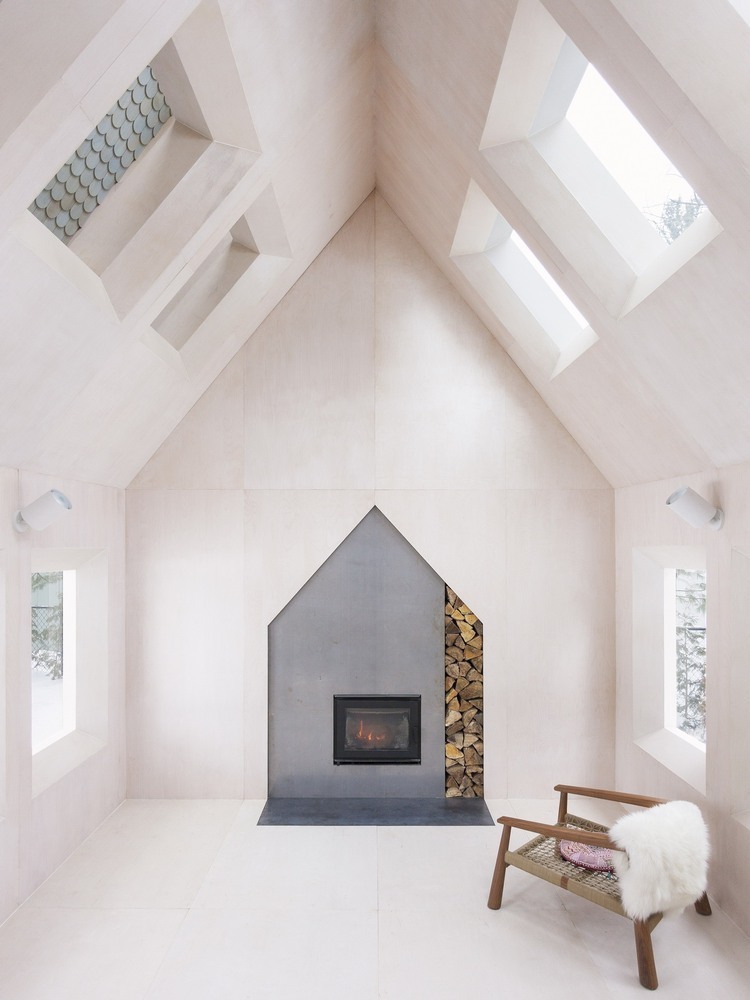 Lake Cottage is a reinterpretation of living in a tree house where nature is an integral part of the building. In a forest of birch and spruce trees along the Kawartha Lakes, the cottage is designed as a two storey, multi-uses space for a large family. The structure composed of a 7m high A-frame pitch roof covered in black steel and charred cedar siding. A deep cut in the building volume creates a cantilever overhang for a protected outdoor terrace with mirrors to further give the illusion of the building containing the forest inside.