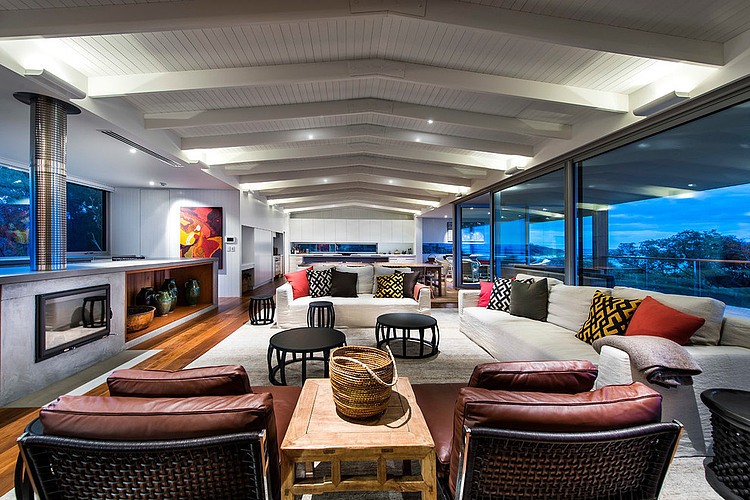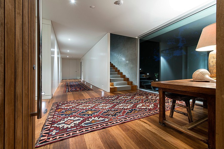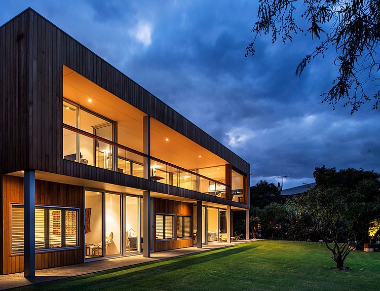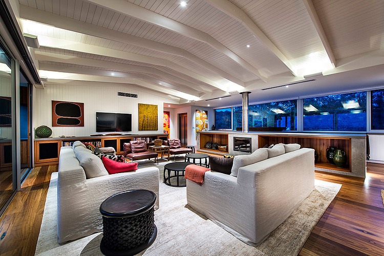 The use of natural timbers are predominant, with the recycled tallow-wood floorboards, painted white cedar-lined ceilings and walls and solid cedar cabinets dominating the interiors whilst the complete exterior is clad vertically in pacific teak. These raw timber textures juxtapose to the more industrial element of polished concrete in the feature wall of the staircase and the matching polished plaster of the fireplace.