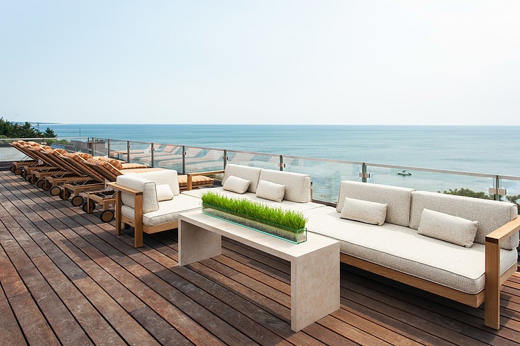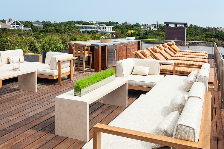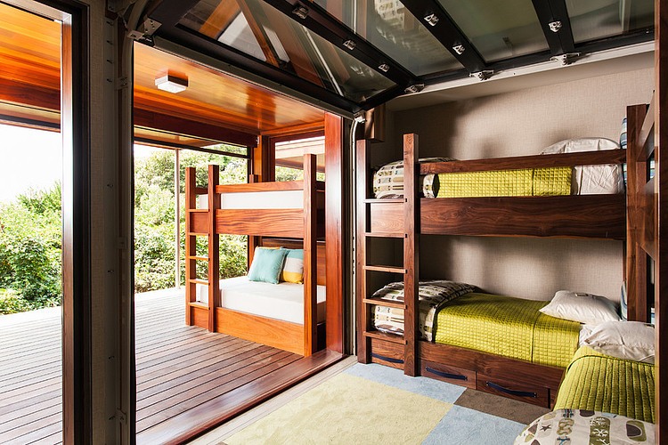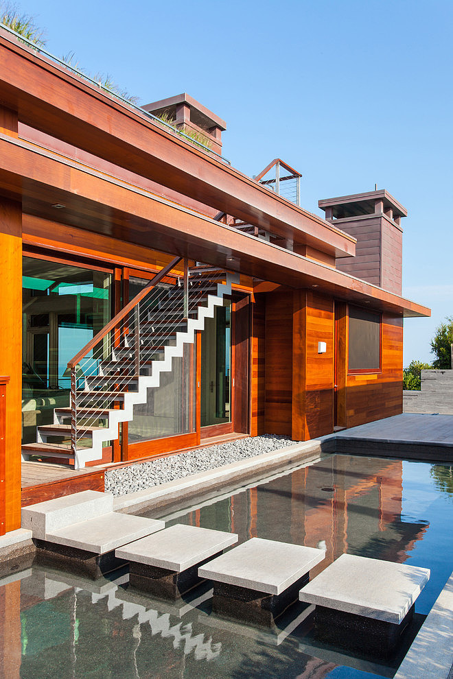 Large sliding glass doors on either side of the house allow ocean breezes to flow through. The flat roof offers a roof-top deck with fireplace. Interior finishes include wooden walls and stone floors.