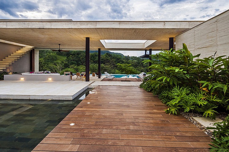 The walls and slabs are built by using in situ concrete, and the ocre tone achieved by using a mix of white cement and sand from Ambalema; the formwork was built with Tabebuia timber. The other predominant material is teak (from sustainable forests), used indistictively as facade, furniture or floor finish. The floors, aiming to keep uniformity with the tone of the roof, are mostly built in sandstone.