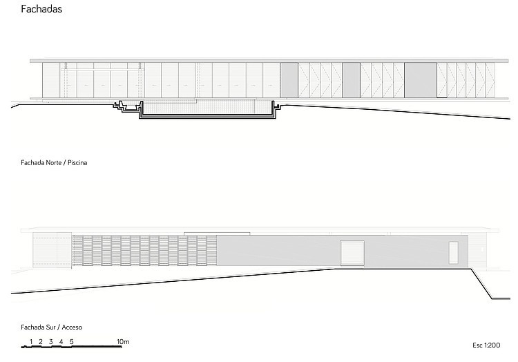 The main sustainibity strategy comes from the spatial distribution and orientation of the project; the north-south bar scheme minimizes direct solar gain on the facades while it allows cross ventilation to all the areas (private and social), minimizing the need for mechanical ventilation. For further insulation, the flat roof was built using a ventilated waffle slab and un upper white gravel finish.