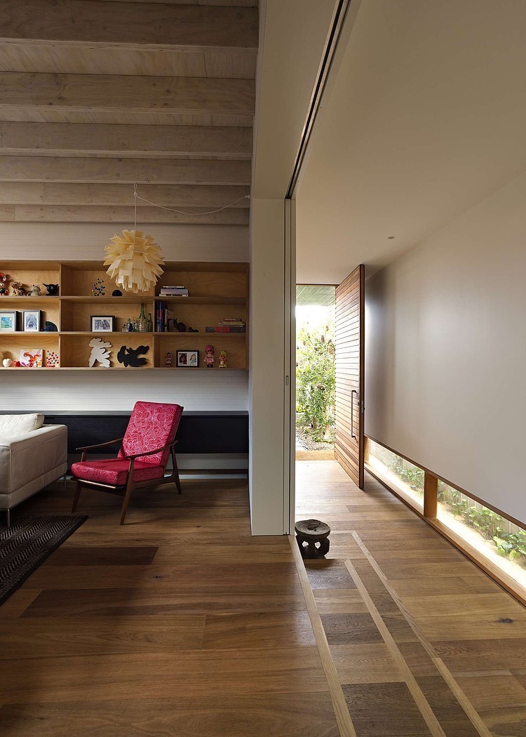 The materials used were affordable and created a coastal feel for the house – ecoply cladding for the body of the house and a concrete capping block to create a textured base for the house. Within the simple block-like building form, the windows were used to animate the exterior. On the lower level the window openings are varied and opportunistic – finding points of sky or natural light to suit the specific uses they contain. On the upper level, a continuous strip of windows and screens capitalize on the opportunities for light, sun, and outlook that the second story allows, framed by privacy screens to account for their added exposure.