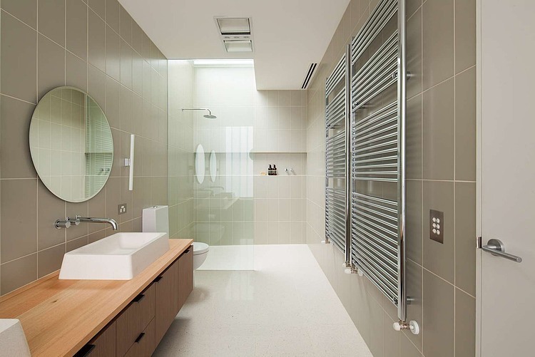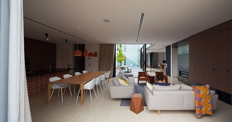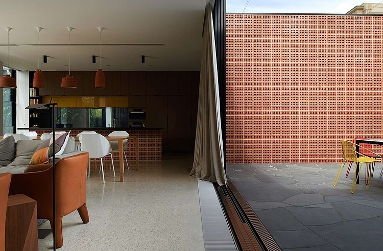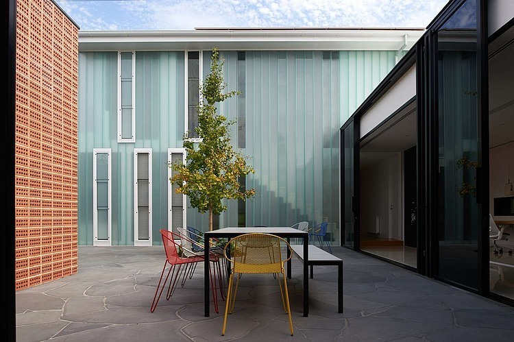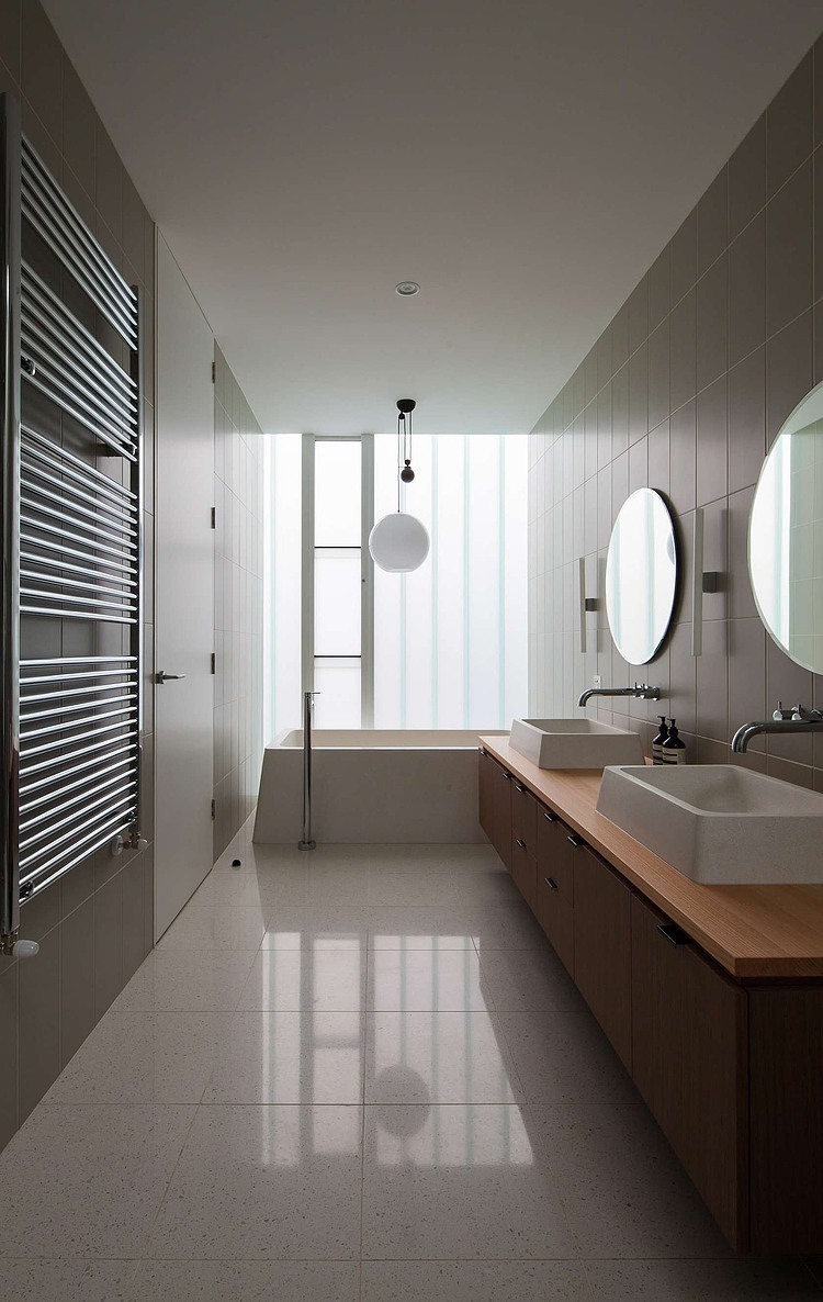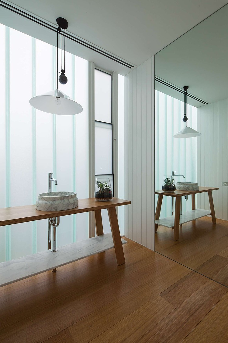 The approach to materiality was playful and dialectic. The gridded pattern of the bricks and the straight vertical lines of the U-profile glazing are juxtaposed against the paved Mintaro slate courtyard floor; the heaviness of the bricks was contrasted against the lightness of the U-profile glazings; fine timber veneers and luxurious honed marble are placed directly next to raw unfinished steel.
