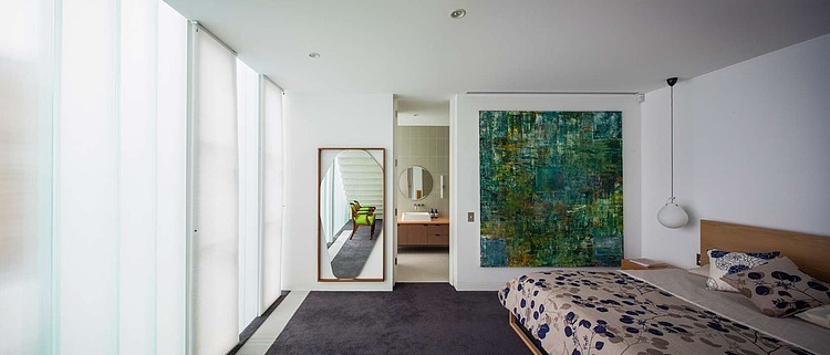 Colors were chosen to compliment the furnishings and predominantly white to act as a backdrop. The client’s favorite color, yellow, is dotted throughout the entire house, intermingling with other yellow objects – the entry coat peg, the awning, the rug, Dion Horstmans’s sculpture, basin mixers, chairs in the courtyard, the kitchen cupboards, and the monkey bar in the backyard. It is a playful journey that invites one to connect the dots.