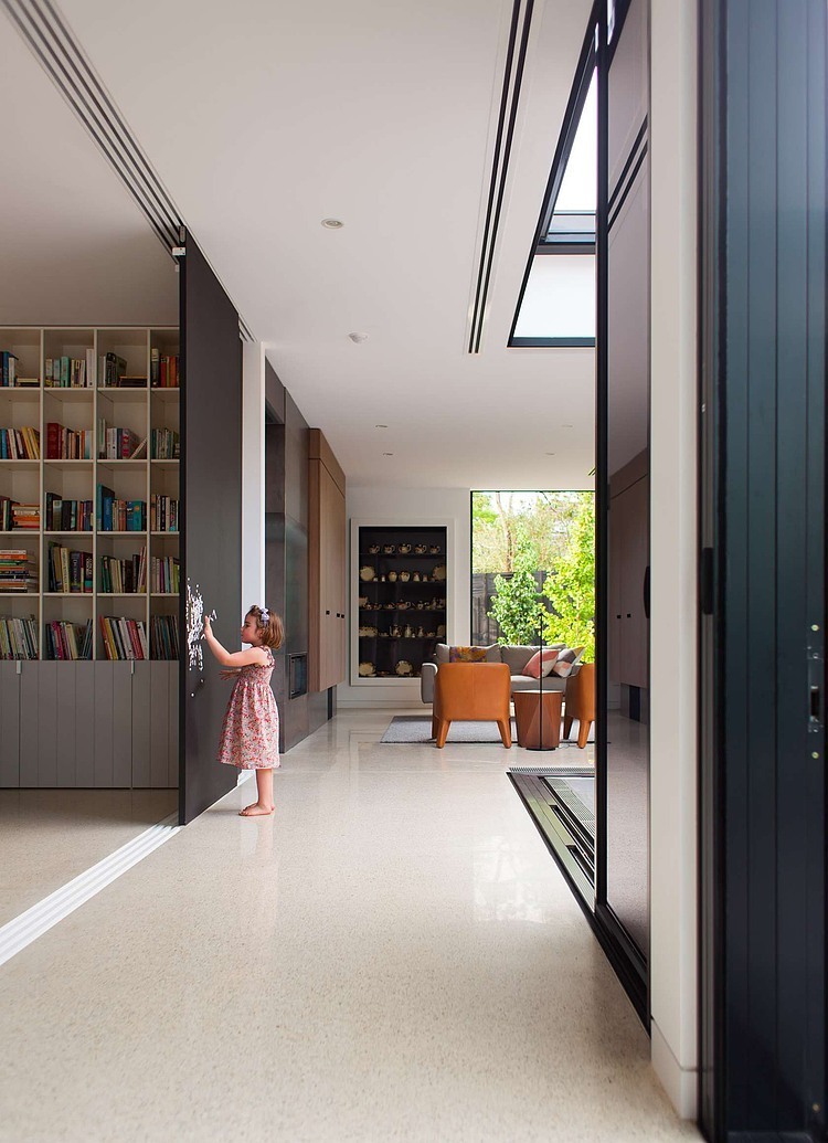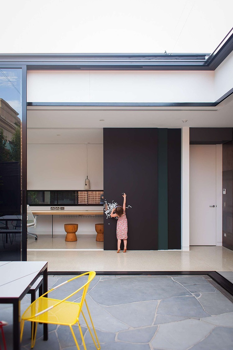 The Courtyard is the link between the old and new, with the long corridor and sewing room forming part of this connection. This central courtyard allows light and air to penetrate into the depths of the building plate. Much like a Japanese Imperial villa, multiple layers of sliding doors and screens modify the spatial relationship between indoor and outdoor, transforming the circulation space into an extension of the courtyard, or using the retractable flyscreen to create a shaded, airy passageway on hot summer days. The space was designed to accommodate a flurry of activity throughout day and night, the direct connection to the courtyard making it perfect for children. With that in mind, the screens are painted as chalkboard with magnetic undercoat, activating an otherwise utilitarian transitional zone.