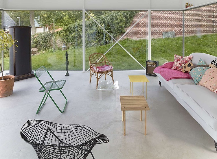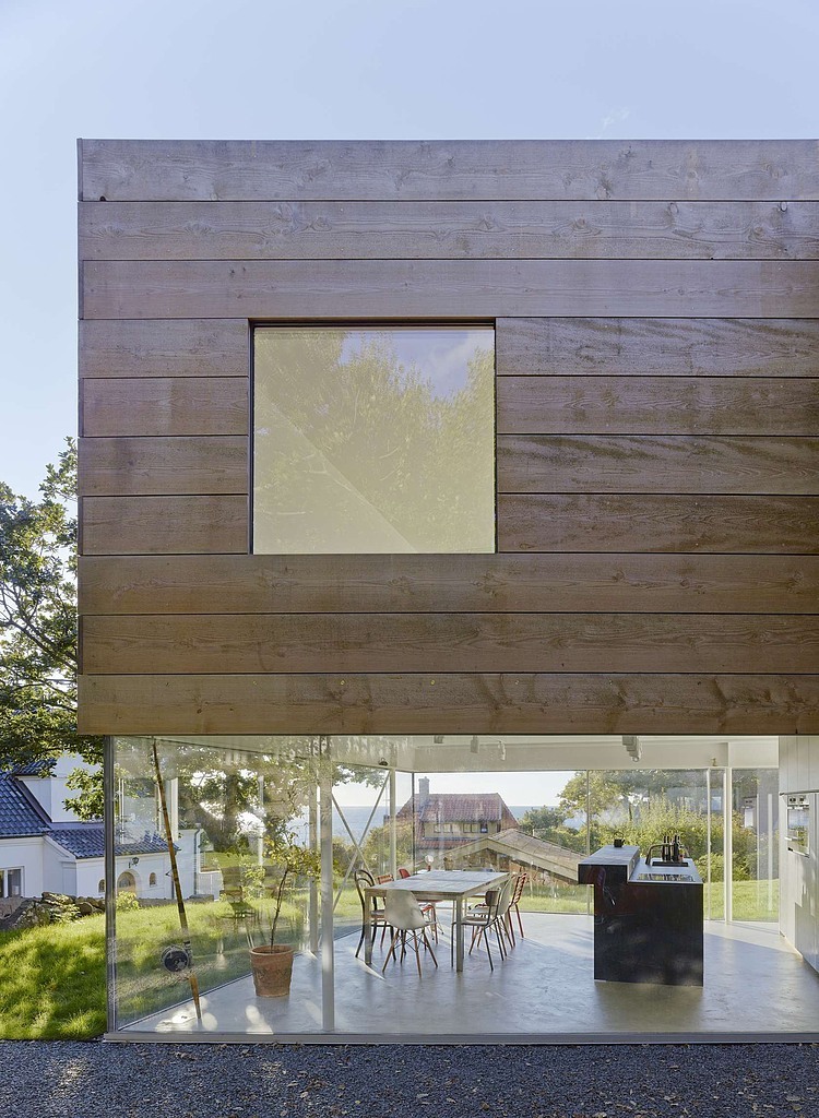 On the ground floor, a pilotis space wrapped in low iron glass, with sliding doors and undivided panes almost 23 feet wide, are framed by the garden and its stone walls. The upper volume is resting on a slender steel structure in an abrupt collision between glass and saw finish Douglas planks in jumbo format — a facade which is the first of its kind, just like Mölle’s most famous house, the Villa Italienborg’s chess-board ethernite shingles facade was, back in the days.
