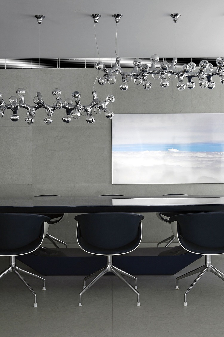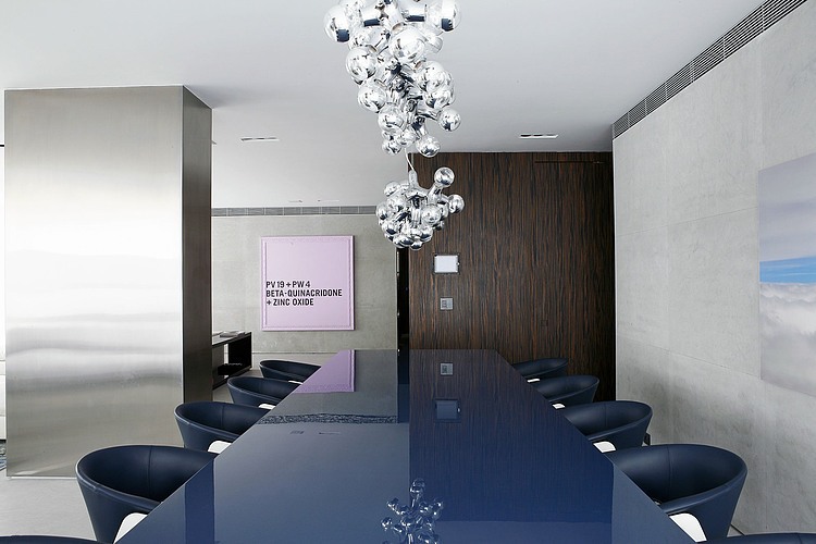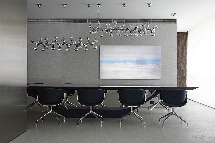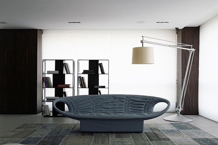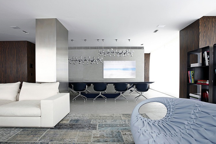 The decoration was planned for a bachelor who receives his 3 kids on weekends and likes to receive his friends. The masculine climate has determined the finishings and tones, grey limestones on floors and macassar ebony covering walls. The furniture have a subtle color interference, like the dinner table colored in petroleum blue lacquer. Fluid lines and sophisticated pieces punctuate the decoration thought to be increased little by little, in order to print the owner style.
