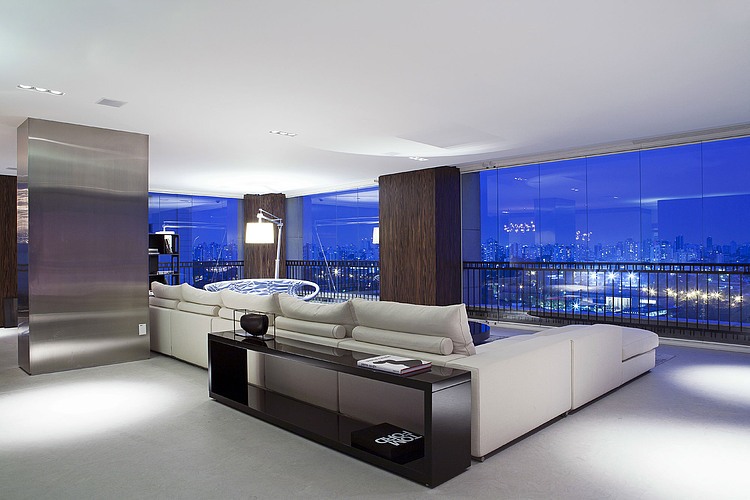 The apartment of 350 m² (3,767 ft²) in São Paulo, Brazil was totally renewed by the architect who decided to put down all the walls, integrate the spaces and explore to the limit the fabulous view of the apartment, from where it’s possible to see the astonishing skyline of the city.