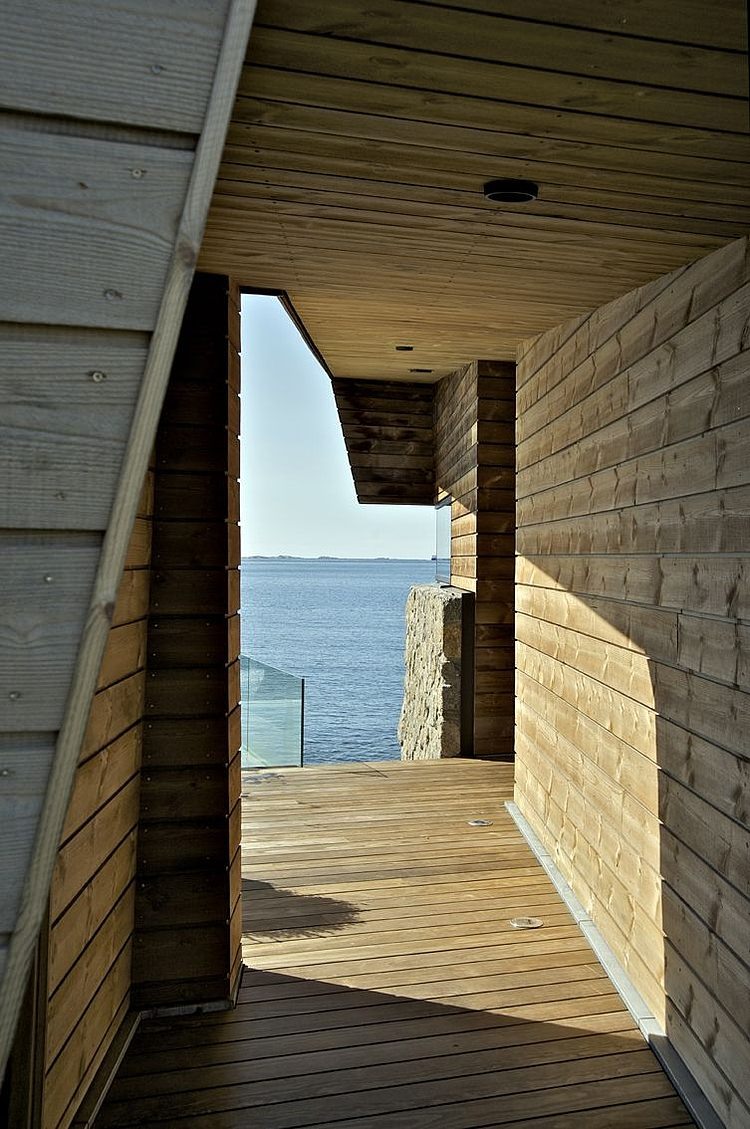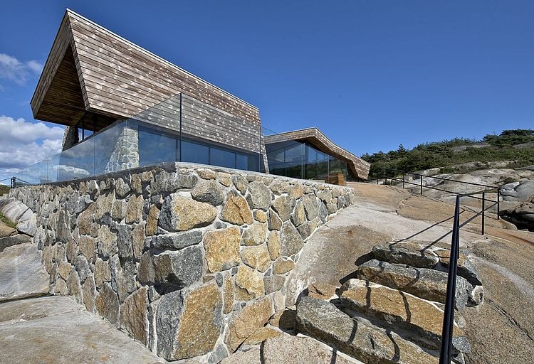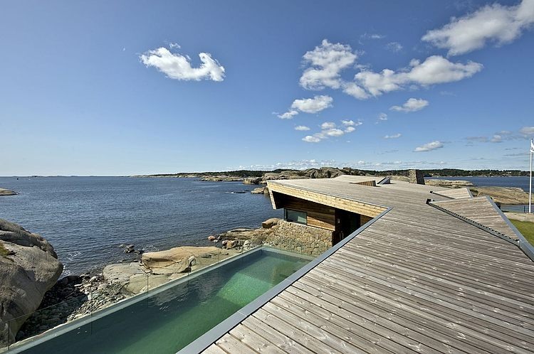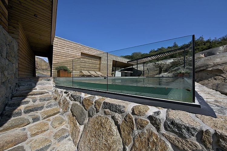 The low elongated volume is cut into to allow for wind shielded outdoor areas, embraced by the house itself. These cuts also bring down the scale of the building, and together with the local variations of the section, make the building relate to the surrounding cliff formations. On the outer perimeter of terraces and pool, a glass fence also protects against wind, but allows for maximum view. The house is clad with Kebony wood, a sustainable process of treating the wood to allow for good durability towards the exposure to salt water.
