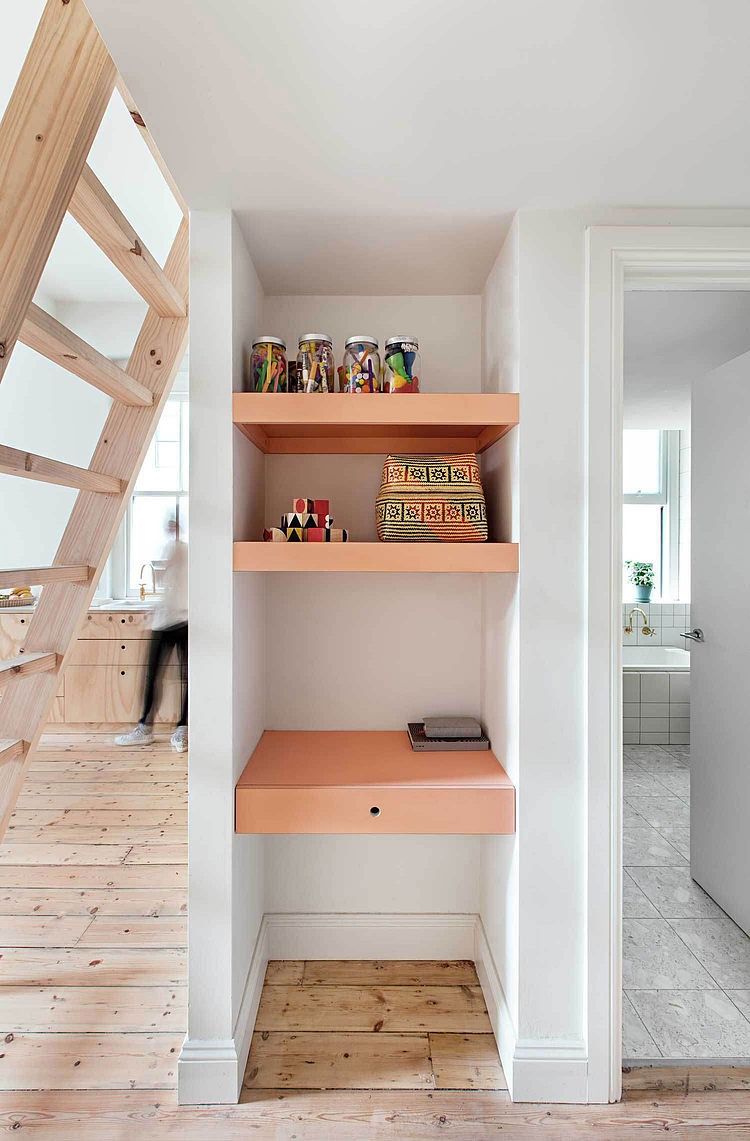 The full-height joinery not only separates the master sleeping nook from the baby’s room, but incorporates lots of flexible inbuilt storage, accessible from both inside the bedrooms and outside. A mezzanine loft allows access to an additional storage cavity, while salmon laminate creates a tidy work station in the nook below. The bathroom is fitted with common but creatively composed tiles, and gold electroplated tapware – for a little bling! – in this otherwise understated city pad.