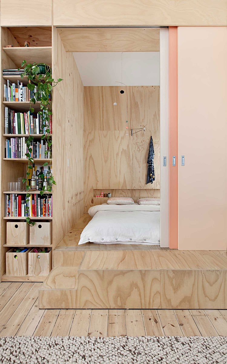 The clients, who were expecting a baby at the time, wanted to convert the only bedroom into two small bedrooms. Plywood joinery was used to define spaces rather than build walls. The child’s bedroom was sized to just fit a single bed between walls. The adults bedroom utilises 3 colourful sliding screens which allow the room to be totally screened from the living room or opened up to allow the bed platform to be used as part of the living space.
