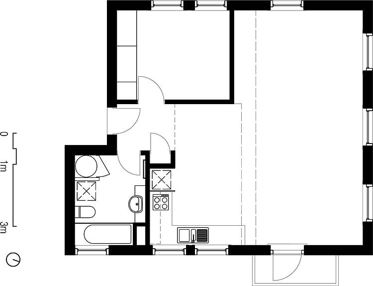 At 7.5 metres x 10 metres (24.6 x 32.8 feet) and with high ceilings and abundant natural light from windows along three of the four walls, the open, functional space utilises readily available, affordable materials to make the most of a small space and a modest budget.