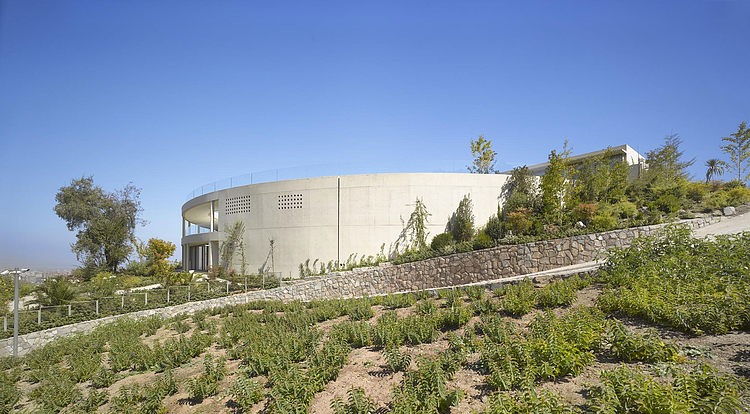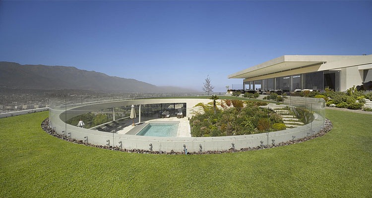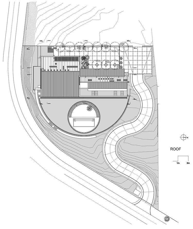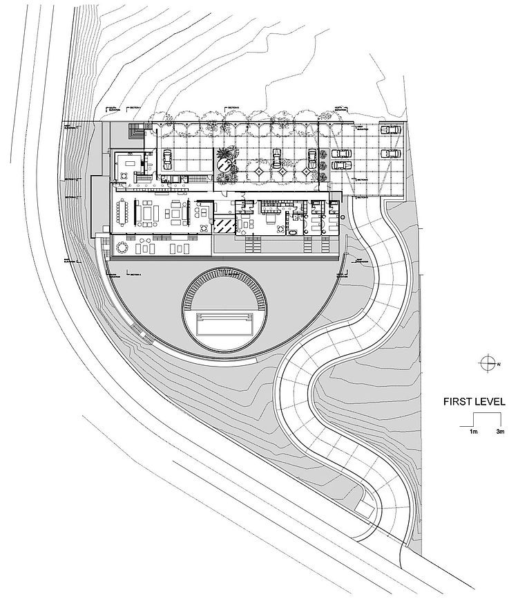 The living rooms, dining room, kitchen, and a bedroom wing were placed in one flat floor, along with the entrance patio and garage, at the upper part of the site. A basement beneath the main floor contains a playroom and an interior pool at a lower side of the site, with views in south direction over the city valley. At the same level but in front of the main floor extended pavillion was placed an exterior pool and a barbecue lounge, in circular patio open towards the east to the great mountain chain view. This terrace is partly roofed by a flat semi-circular lawn which forms a garden plan in front of the house main floor pavillion, as a belvedere.