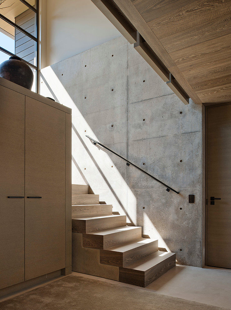 This Washington Park Residence sits on a bluff with easterly views of Lake Washington and the Cascades beyond. The house has a restrained presence on the street side and opens to the views with floor to ceiling windows looking east. A limited palette of concrete, steel, wood and stone create a serenity in the home and on its terraces. The house features a ground source heat pump system for cooling and a green roof to manage storm water runoff.