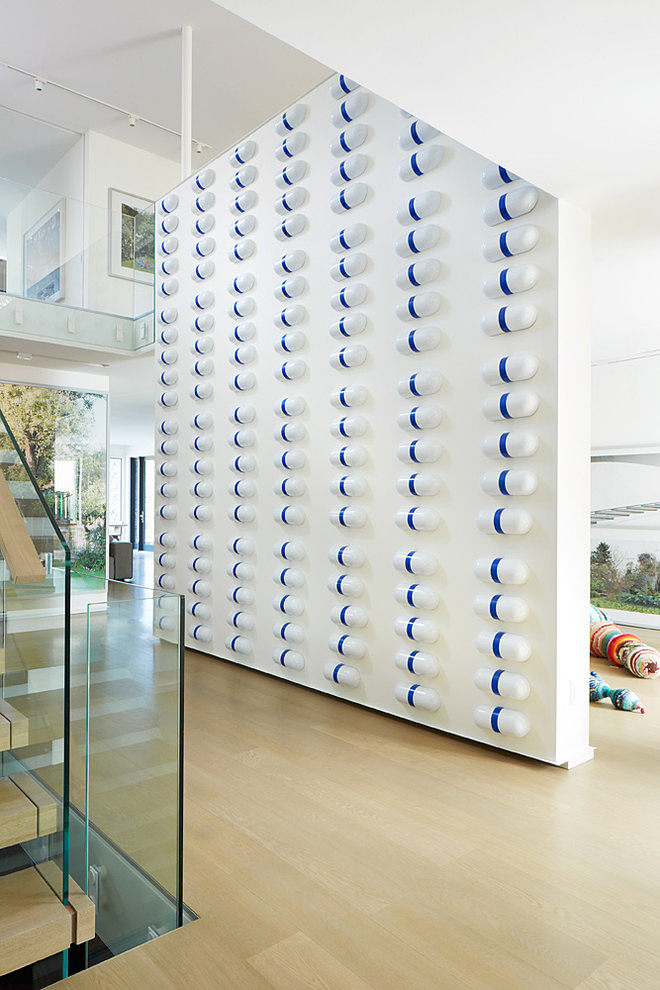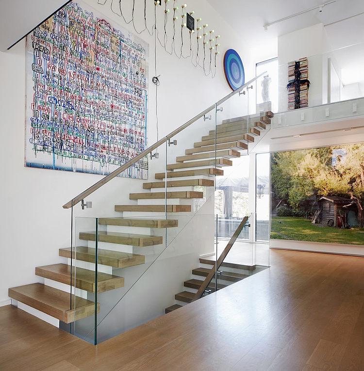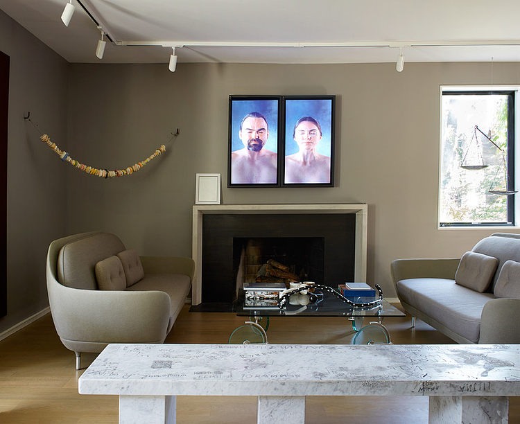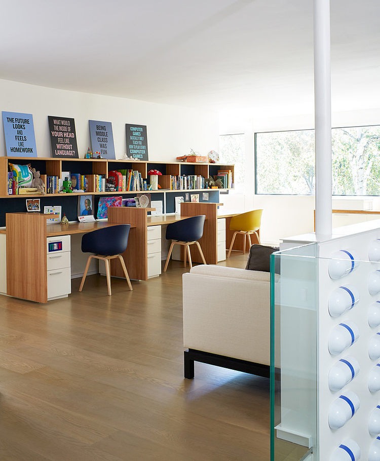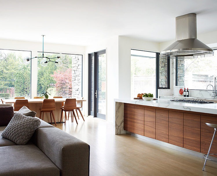 Built in the 1960’s, the existing house mimicked an Arts and Crafts vernacular with dark wood paneling and a labyrinth of rooms. The house was gutted, and walls relocated to create an open flow of space. Avid art collectors, the owners requested a flexible environment to showcase their growing collection. A new floating stair of oak treads on white painted steel links the ground and second floor. The kitchen/family room beyond features a palette of wide plank oak flooring, walnut millwork, leathered Calcutta marble and stainless steel.