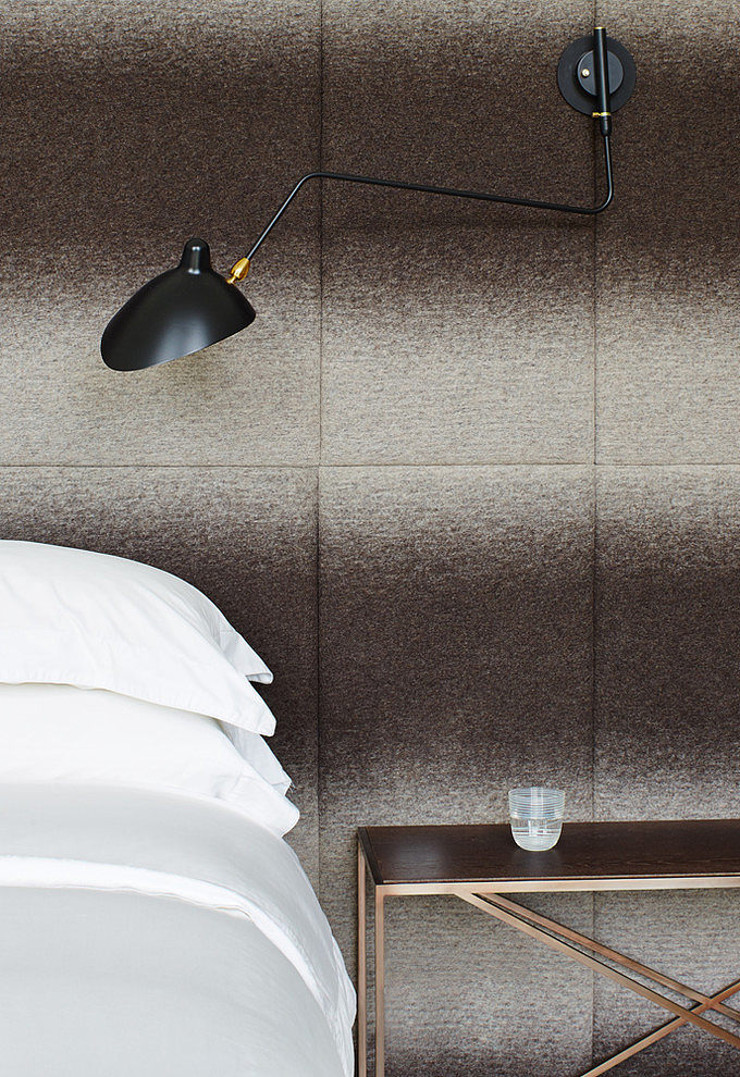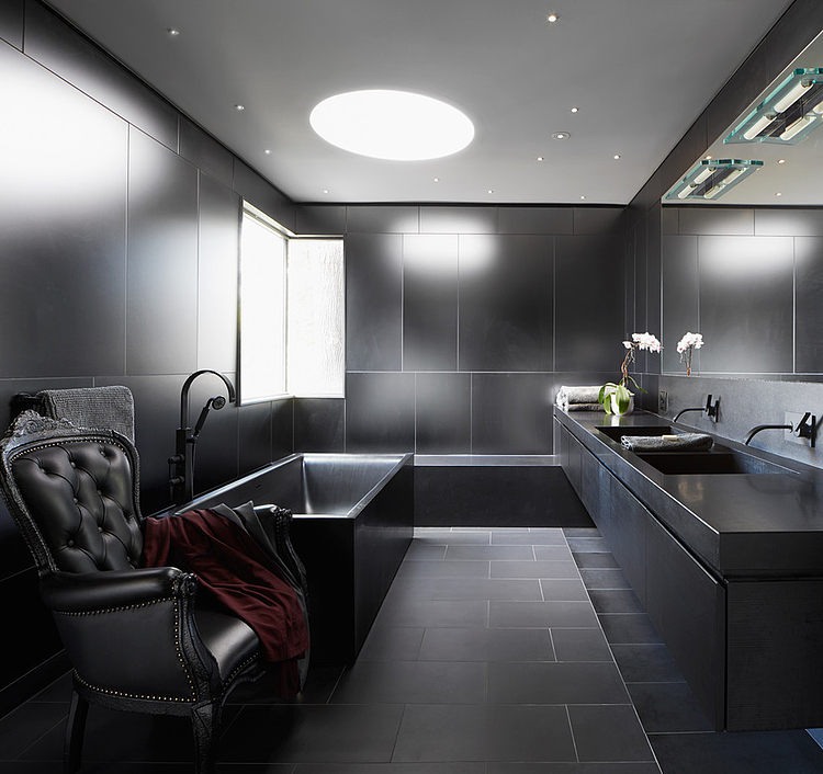 The master bedroom ceiling was substantially raised to take advantage of the unused space in the attic above, and the end wall was opened up to create a wall of glass looking out to the garden. In the master bathroom, a variety of different materials and textures are used to create a rich composition – acid etched black mirror, black granite, textured black tile and ebony coloured wood – in response to the client`s request for an all black bathroom.