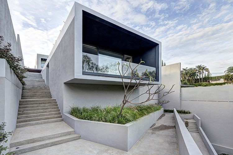 Crossing the lawn, beyond the living spaces on the ground floor, a pool and a concrete volume containing an entertainment room overlook a small ravine outside of the property. Below this volume a staggered pathway descends gently to negotiate the changes in topography on a pronounced cliff, leading down to a lower landscaped area.