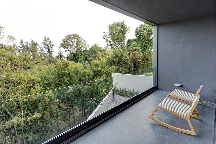 Expanding on the theme of permeability that dominates the ground floor, similar solutions were implemented throughout the living quarters on the second level, to allow for private, open spaces. Such is the case with the small, glazed atrium that ventilates the master bathroom and the deeply recessed balconies that yield generous exterior areas to all bedrooms.