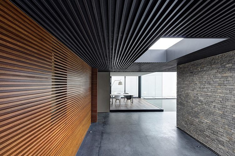 Dark gray steel, glass, wood, concrete and stone compose the greater part of the material palette throughout the house, which is complemented by accents in leather and stainless steel. The master bathroom receives a special treatment as it is covered almost in its entirety with white marble.