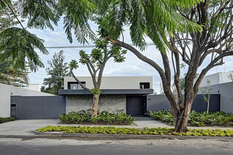 Breaking with the norm established by all the houses in the vicinity, Casa GR recedes a considerable distance from the setback line, to yield a large open space below the tree canopies, a stark welcome gesture.