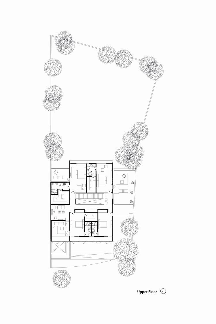 The second floor includes four bedrooms, each with its own bathroom, a TV room and a series of elevated terraces that serve each room privately. Vertical circulation between the two levels is granted through a stair that is conveniently located at the central area of the house. The stairway is articulated as a cascade of thin stone platforms and is flanked by a wooden railing that follows the staggered rhythm of the steps at its base. This central space is lit by an elongated skylight which filters daylight through a series of louvers.