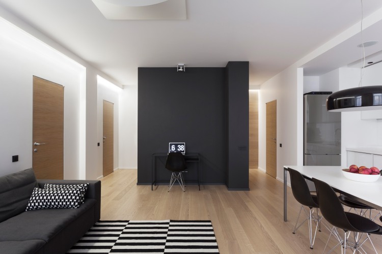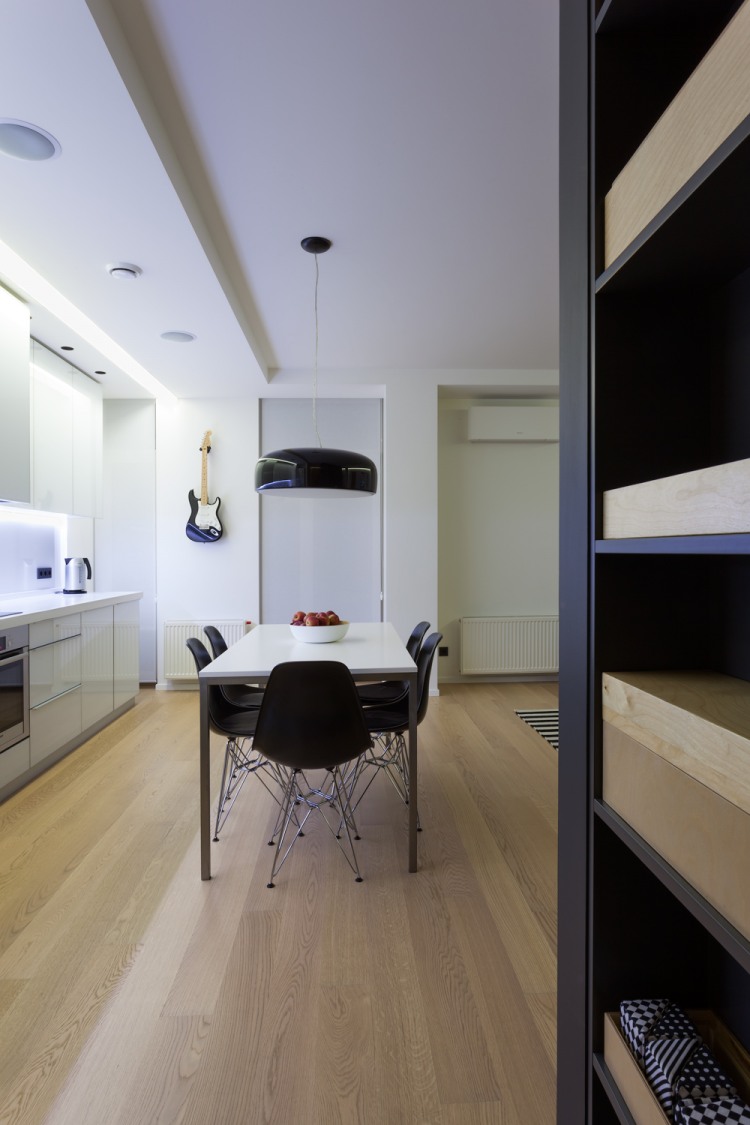 The main requirement was to fit the list of functional areas and facilities, needed to comfort, in a small apartment thus to make an open and functional space.Living room with a comfortable sofa combines with a snow-white kitchen and dining room in a single space, creating a cozy atmosphere to spend time with friends and family.In the private area architects managed to not only accommodate a separate bathroom with hidden entrance behind the wardrobe sliding doors, but also isolate separate area for laundry from the toilet space.Monochrome range with bleached oak elements creates comfort and complete interior.