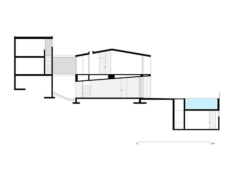 The house is developed in two volumes separated by a garden and connected by a bridge. Parking and service areas organize the access level. From here, the stairs lead to the main access. Within the first volume, we have place on the ground level the living and dining space and the kitchen; bedrooms were placed in the second level. The subsequent volume hosts a working studio, facing the inner court. Each spaces has a proportion and a characteristic relation with the adjacent space, as well as a relation with the existing Landscape.