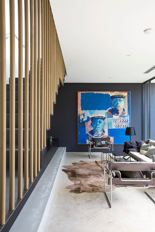 A separate form abuts the rear right of way to house a garage which also provides a much desired roof deck off the master bedroom upstairs with city views. Fixed aluminium vertical louvres to the master bedroom windows and structured planting around the deck help to provide visual privacy.