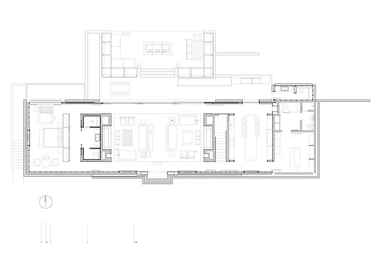 The relaxed architectural program and its flexibility in its spaces, reinforces the owner’s strong personality and intense social life. The main access collides with a large body of water that is parallel to a drinking space for horses, while a low wall made of wooden railroad ties discretely hides the area so cars may be parked and appear to be isolated from the construction.