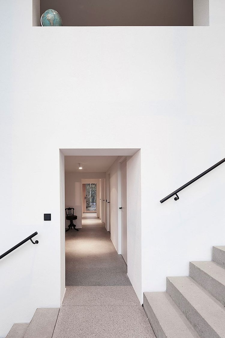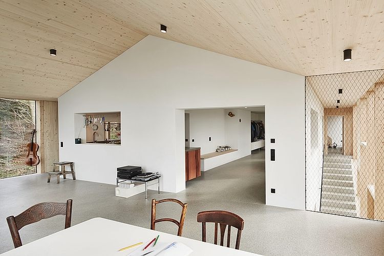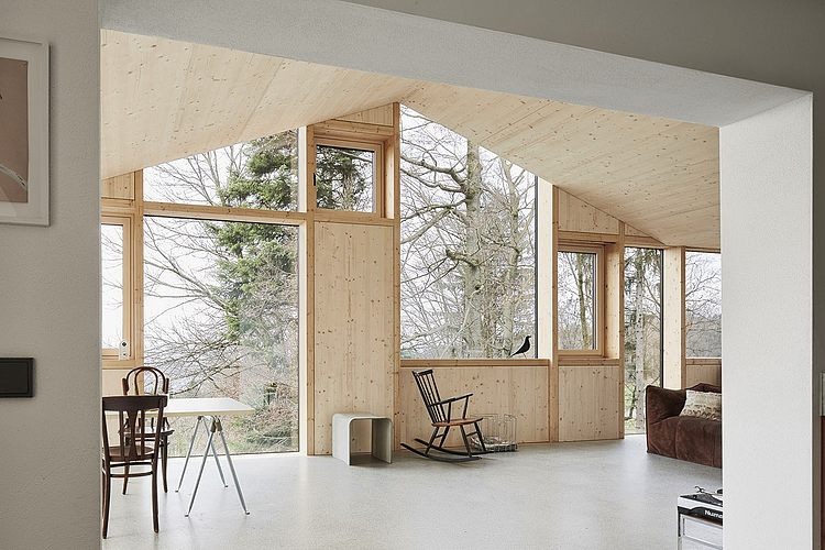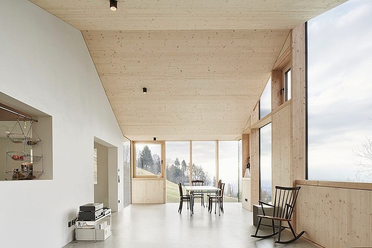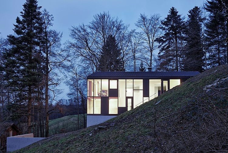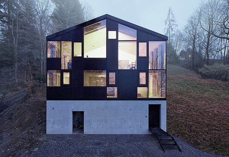 “Haus Hohlen” was originally built in 1961. The building is situated on a hill above Dornbirn, Austria. The site, which is protected on the uphill side by a small forest, provides an astonishing view over the Rhine delta and Lake Constance. In 2012 the house, with an area of 85 m², became too small for its four inhabitants and had to be expanded fundamentally. In the beginning, “Haus Hohlen” was gutted due to the fact that the existing stonework was the only building structure worth preserving. Obsolete fixtures and ineffectual refurbishments were dismantled. Given the need to increase the amount of space and renew the façade, the idea came up to construct a new building envelope a certain distance around the old house. The chosen lightweight timber stick-construction offers all the advantages of modern timber structures: High prefabrication level, quick construction, sustainability and a good indoor climate. The wooden frame construction is intended as a spatial contrast to the existing solid structure. The existing roof was extended 4 meters on the verges sides and 1.5 meters on the eaves sides. Due to the position of “Haus Hohlen” in the middle of a natural setting, a large amount of glass was used. Well-proportioned windows offer great views to the valley and the forest. Together with randomly arrayed closed wall elements, the windows generate a sophisticated pattern façade which offers both open and more shielded spaces indoors. Inside, it was important to keep the old house’s structure recognizable within the new: Old windows became passageways, an old kitchen window became a pass-through; another window became a niche for a basin. The new building skin with up-to-date, highly effective insulation and triple glazing guarantees very low energy consumption. The insulation is made of organic materials such as wood fibre or foam glass. A new heat pump with geothermal probes replaces the existing oil heating. All rooms are equipped with floor heating, and therefore a new screed was necessary for the whole building. The screed’s surface was merely sanded, no additional flooring was used. Now a new homogenous floor surface visually connects the old and new parts of the building. The new façade is a wood-aluminium frame system. All unglazed parts are filled with wooden panels that are covered with a water vapour permeable coating often used in boat building. The dark colour harmonises with the forest in the background.