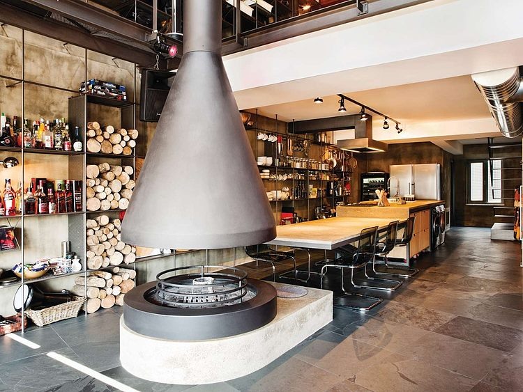 – Finally, the cast-concrete block surface, which forms the kitchen counter framed in an iron structure, steps down and transforms into a cantilevering dining table and ends as a short plinth at the hearth, which also allows extra seating around the table.