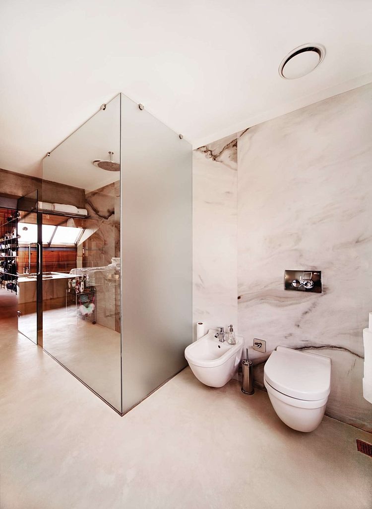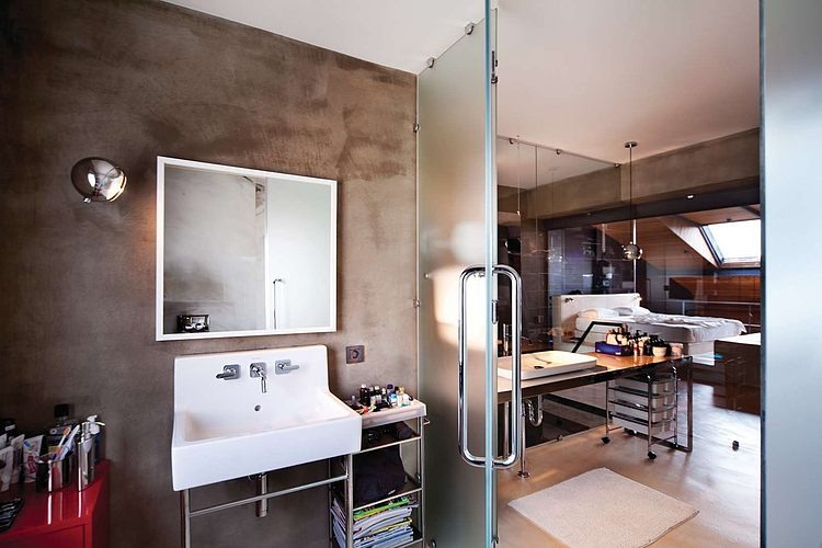 – Throughout the mezzanine, the surfaces were covered with a cement-based material, uninterrupted, for a pleasant feeling for bare feet. The surrounding floor is made of the same material, including the shower and the block, which nestles the bed and the bathtub.