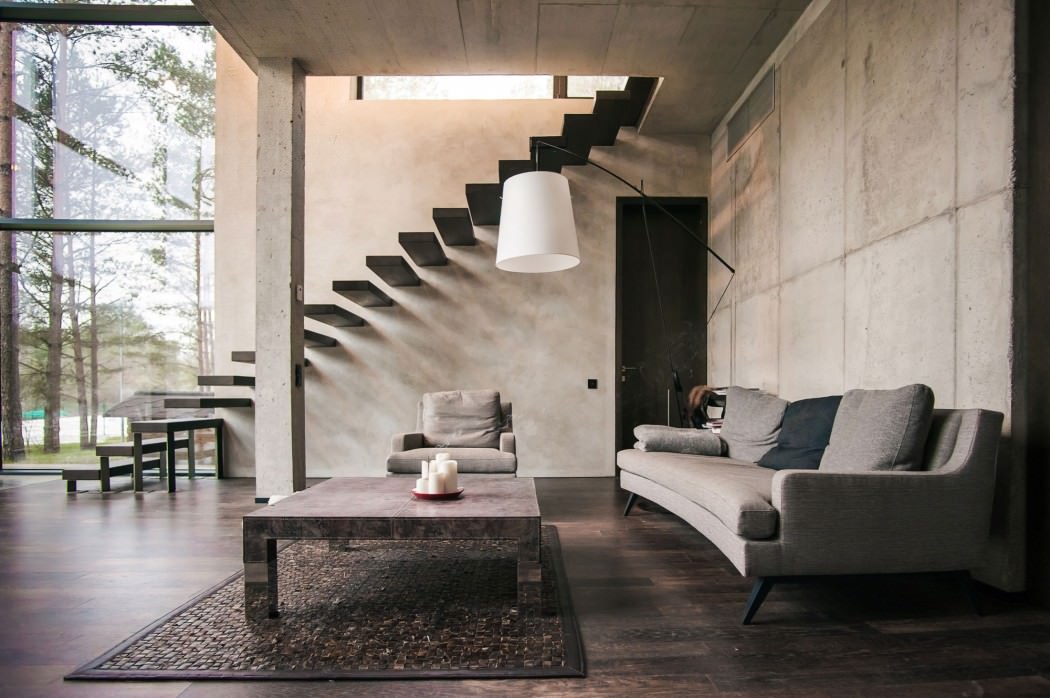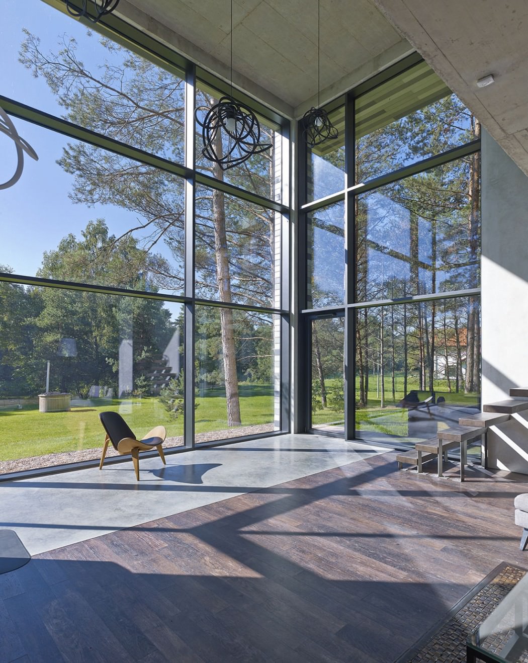 Exterior and interior finishes are made with natural materials – mainly concrete, wood, metal, choosing the gray tones of birch stump to replicate the colour motifs.