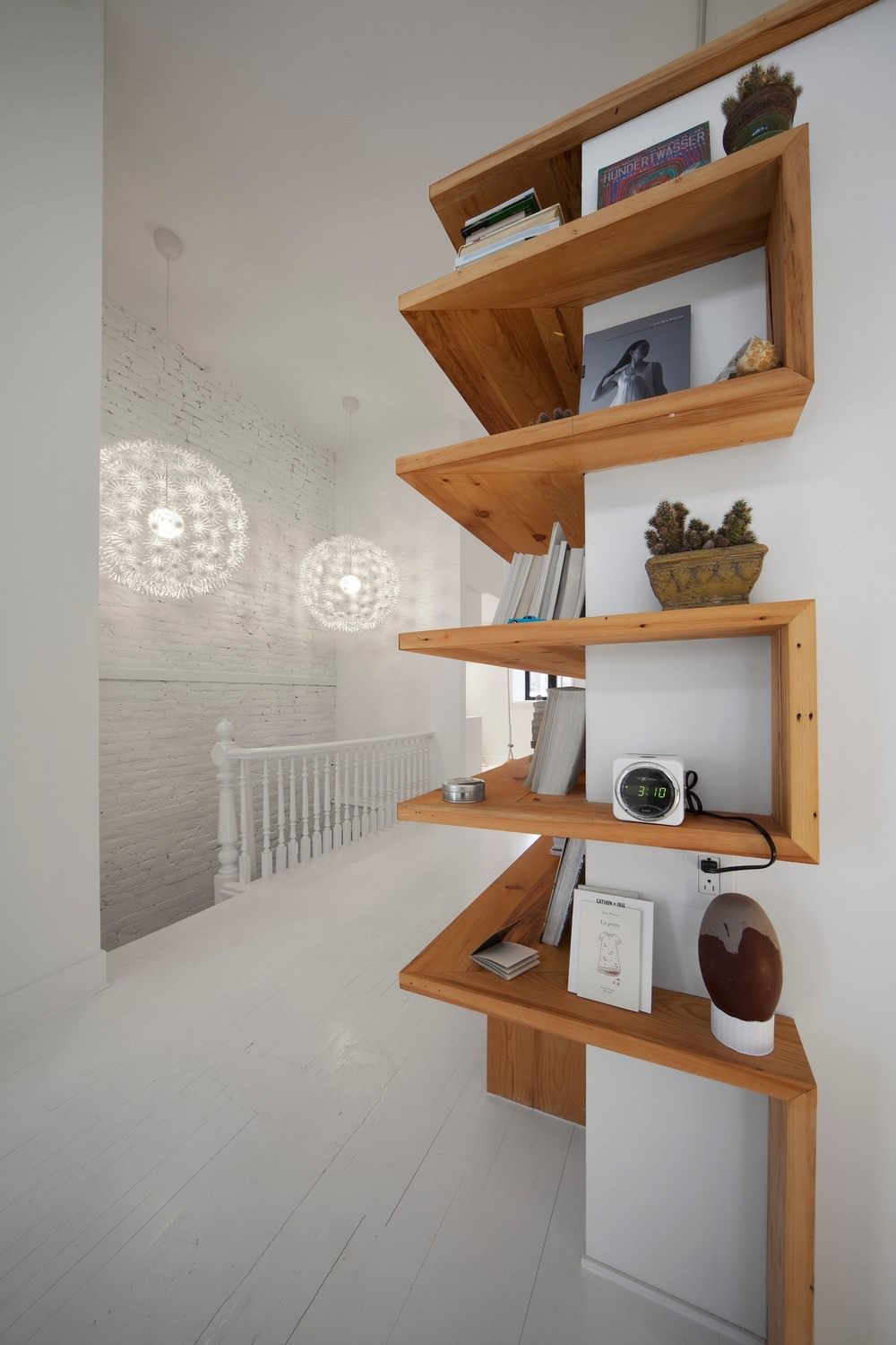 The patina of the aged wood is preserved and highlighted by contrast as the surrounding are composed of abstract white surfaces. The shelves winding around the volume seem to protect a secret.