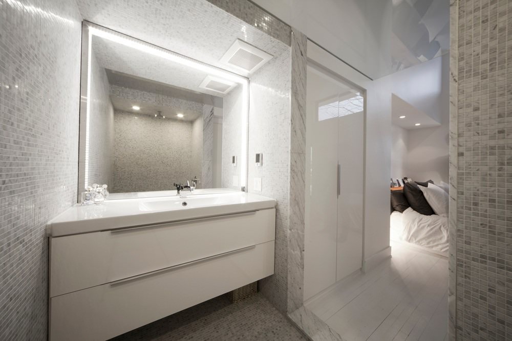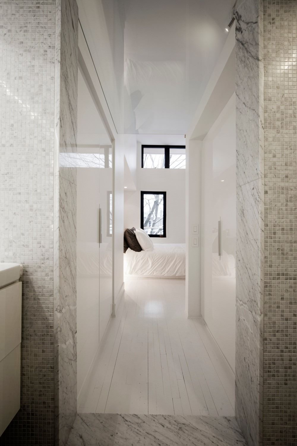 This volume is sliced in two by a tempered glass roof, bringing natural light into the marble tiled shower.