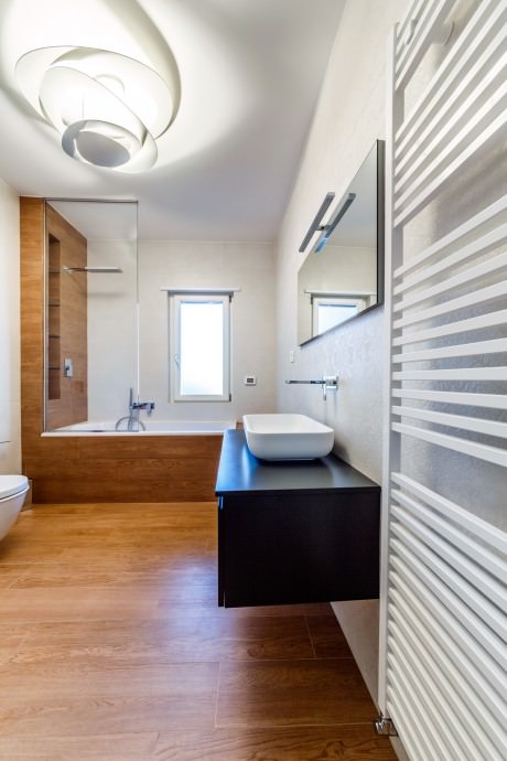 The Monolithic House is an apartment located in Castrovillari (CS), in the southern Italy, so defined because the creative concept behind the project plays with the volumetric subtractions of a monolithic block. The majestic views of the Pollino massif mountains, clearly visible from the luminous windows of the apartment, lead to the choice of the stone as conceptual raw material. In addition to stone, predominant natural material is the wood that warms the environment from the entrance, place where it is immediately enveloped in a surreal atmosphere: a rain of Swarovski crystals adorned the walls, dotted of sparkles. Constructive tension element of interior design around which takes place the open space is the monolithic block, ie the stone wall’s partition between kitchen and living room, characterized by a window which performs the dual function of table or support plane.