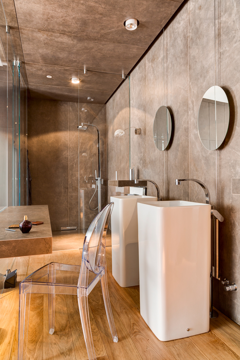 The transparent wall which delimits the bathroom behind the bed has been designed with special crystals that allow natural light to penetrate while blocking the view in the central part of the crystal.