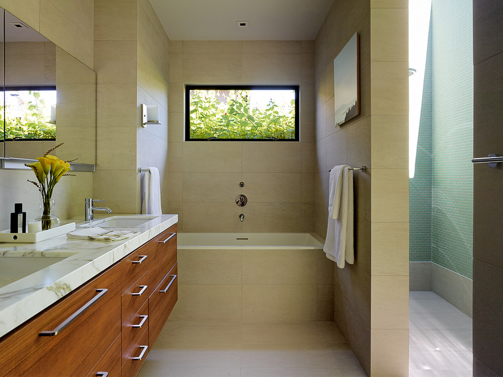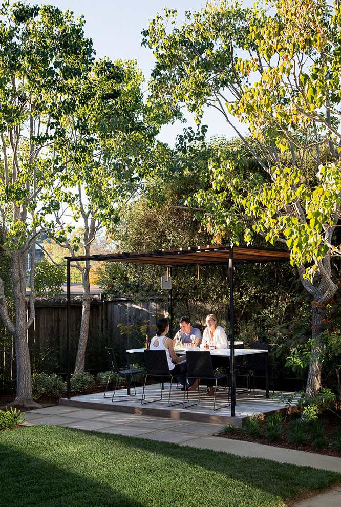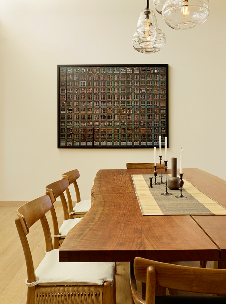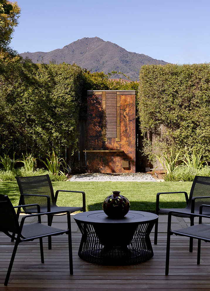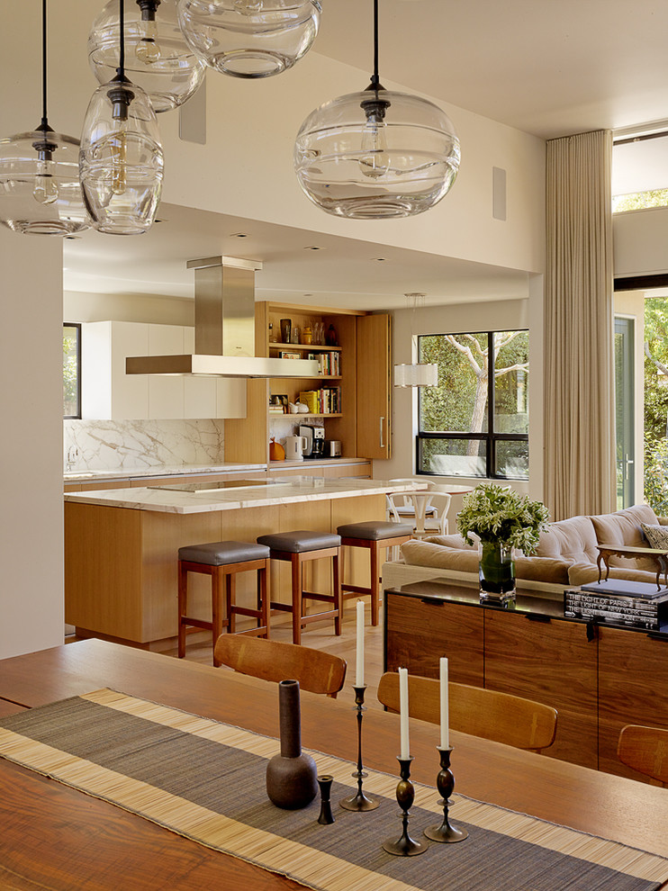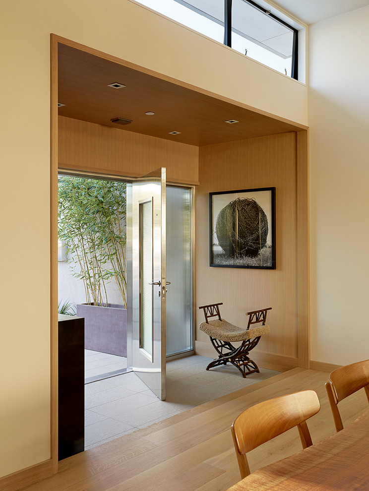 The West facade was completely opened up to the garden and the view of Mt. Tamalpais, further increasing the sense of space in the main living room. A limited palette of white oak floors and cabinets, white lacquer accents, and Calacatta d’Oro countertops are used throughout the house, to impart a sense of calm and continuity. Scandinavian and Japanese influences are evident in both the minimalist details and the choice of light woods and finishes. The furniture includes a mix of vintage Danish pieces, acquired by the owners over the years, and select custom contemporary pieces from Hughes’ showroom de Sousa Hughes Showroom in San Francisco.