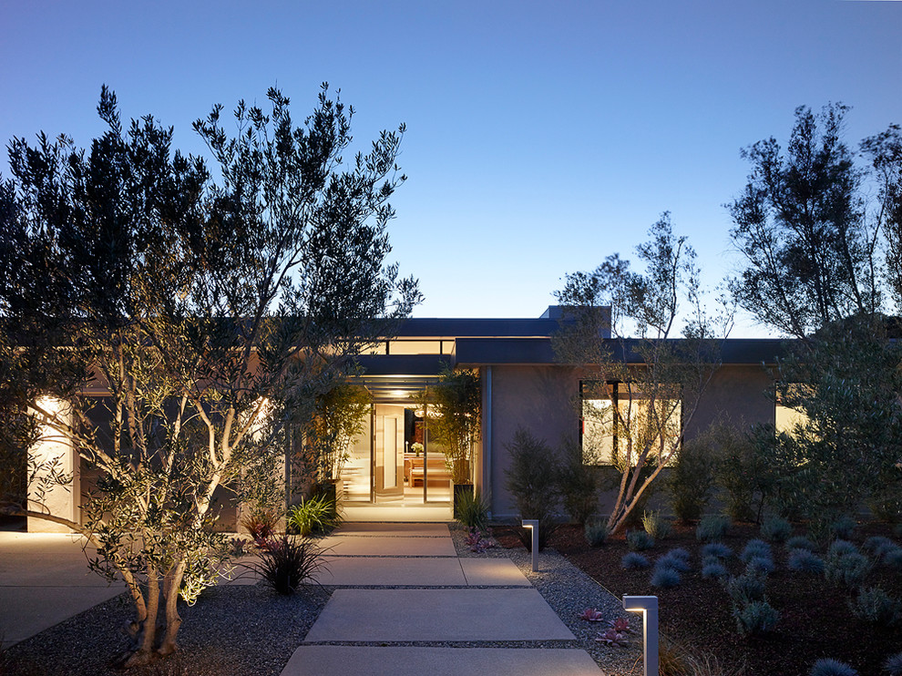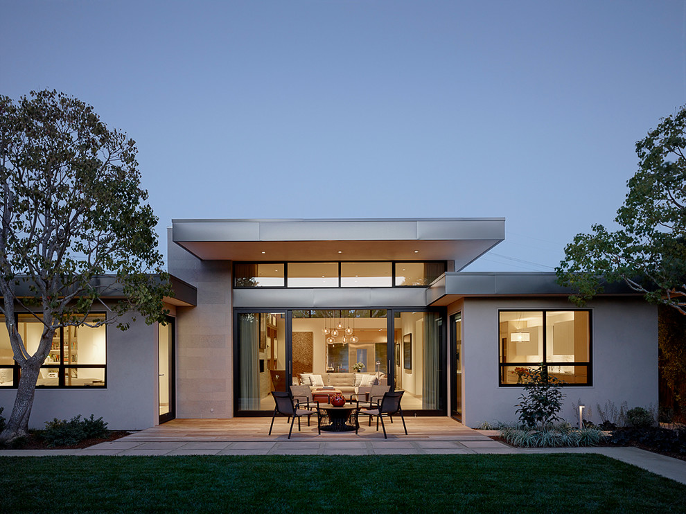 The objective of this project was to completely transform a rather unremarkable 1800 sq. ft. 1940’s ranch style house, into a Modern Mid-Century inspired retreat. LKA removed the standard hipped roof, and replaced it with flat roofs of varying heights, increased the footprint by 220 sq. ft., completely reconfigured the interior, creating a more open plan. The ceiling height of the main living space was increased from 8′ to 11′, and clerestory windows were added to the East to bring in morning light and views of the sky.