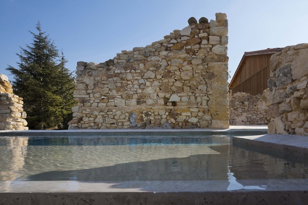The ruins of the farmhouses were preserved so as to frame the new house, while the guesthouse and pool were inserted within the old stone walls. The main house is built with solid sandstone blocks of 50 x 50 x 200cm, quarried next to the Pont du Gard and extracted since Roman times.